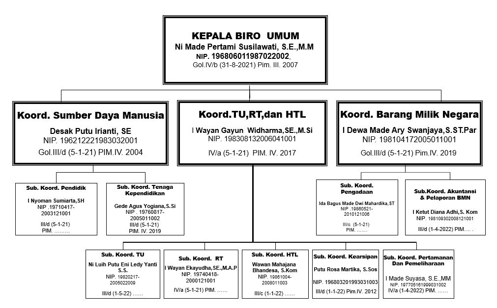 Biro Umum has the task to provide general administrative and financial services at the University of Udayana. To carry out these tasks the Bureau of Public Administration and Finance has the function: